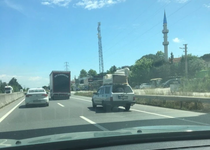 Yalova-İzmit karayolu Çiftlikköy ilçesi mevkiinde Kocaeli istikametinde ilerleyen Tofaş marka Kartal model otomobilin üzerinde koltuk taşındığını görenler gözlerine inanamadı. Bu sırada aynı istikamette ilerleyen bir sürücü, gördüğü ilginç manzaranın fotoğrafını çekti. Araç herkesin şaşkın bakışları arasında karayolunda ilerlemeye devam etti.