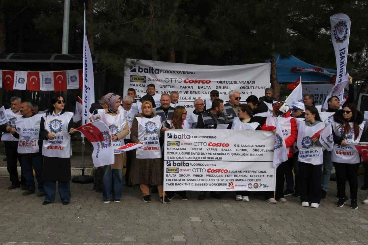 Uşak’ta faaliyet gösteren Balta Floorcovering Yer Döşemeleri A.Ş.’de çalışan işçiler, bir süre önce işçi sendikası Öz İplik İş’e üye oldu. İşverenlikçe çeşitli sebepler bahane gösterilerek, sendikaya üye olan 4 işçi işten çıkarıldı. Yaşananların ardından Öz İplik İş Genel Merkezi, Uşak’ta işten çıkartılan 4 üyesi için fabrika binası önünde eylem yaptı.