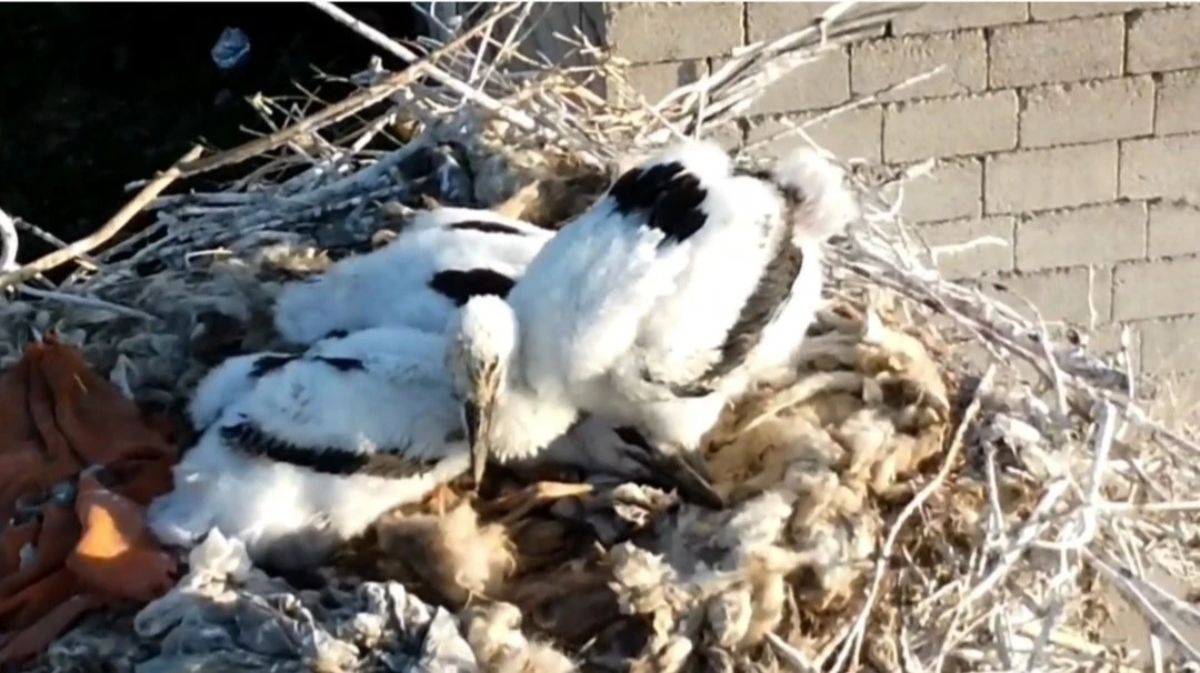 Van’ın Özalp ilçesinde yuva kuran ve kış boyunca göç etmeyerek yuvalarında kalan leylekler yavruladı.