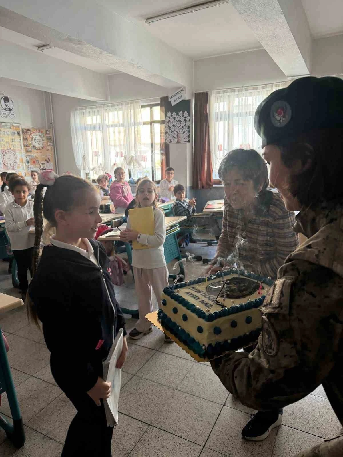 Bingöl’de 2022 yılında meydana gelen patlamada ağır yaralanarak şehit olan Özel Harekat Polisi Necati Aygün, Çine Karakollar Merkez Camii’nde düzenlenen törenin ardından toprağa verilmişti. Şehit Aygün’ün Aydın’ın Efeler ilçesinde bulunan Güzelhisar İlkokulu’nda okuyan 8 yaşındaki kızı Aysel Naz Aygün’e doğum gününde Aydın Özel Harekat Şube Müdürlüğü ekipleri sürpriz yaptı. İlkokul ikinci sınıfa giden Aygün’ün sınıfına giden Özel Harekat polisleri, sınıfa pasta ile girerek küzük kıza hediyeler verdi. Duygusal anların yaşandığı kutlamada, minik Aysel Naz’ın mutluluğu yüzüne yansıdı.