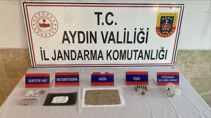 Aydın’ın Nazilli ilçesinde jandarma ekipleri tarafından kaldığı pansiyon odasında yapılan aramalarda uyuşturucu madde ele geçirilirken kadın şahıs gözaltına alına alındı. Aydın’da jandarma ekipleri uyuşturucu madde kullanımı ve ticaretinin önlenmesine yönelik çalışmalarını aralıksız sürdürüyor. Edinilen bilgiye göre, Aydın İl Jandarma Komutanlığı Kaçakçılık ve Organize Suçlarla Mücadele Şube Müdürlüğü ve Nazilli İlçe Jandarma Komutanlığınca uyuşturucu madde imal ve ticareti yapan şahsa yönelik icra edilen faaliyette M.Y. (19) isimli kadın şahsın kaldığı pansiyon odasına operasyon düzenlendi. Odada yapılan aramalarda; 53 gram eroin, 8 gram metamfetamin, 32 adet sentetik hap, 14 adet mermi, 1 adet bong aparatı ele geçirildi. Şüpheli şahıs M.Y. jandarma ekiplerince gözaltına alındı. Olayla ilgili soruşturma sürüyor.