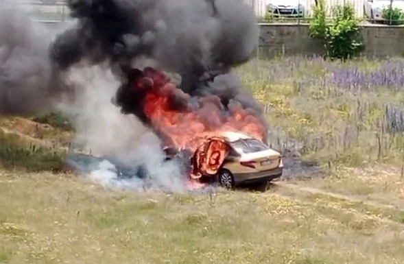 Erzurum’da boş arazide park halinde bulunan taksi bir anda ön kısmından alev aldı ve sonrasında adeta ateş topuna döndü.