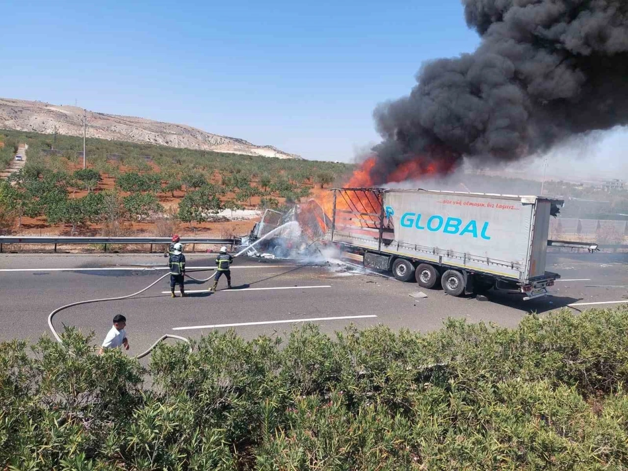 Gaziantep-Nizip otoyolunda park halindeki tıra çarpan bir başka tır alev topuna döndü. Güvenlik kamerasına da yansıyan kazada tır sürücüsü yaralandı.