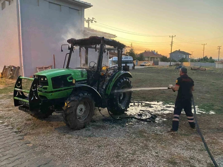 Çorum’un Alaca ilçesinde park halindeyken alev alan traktör yandı.
