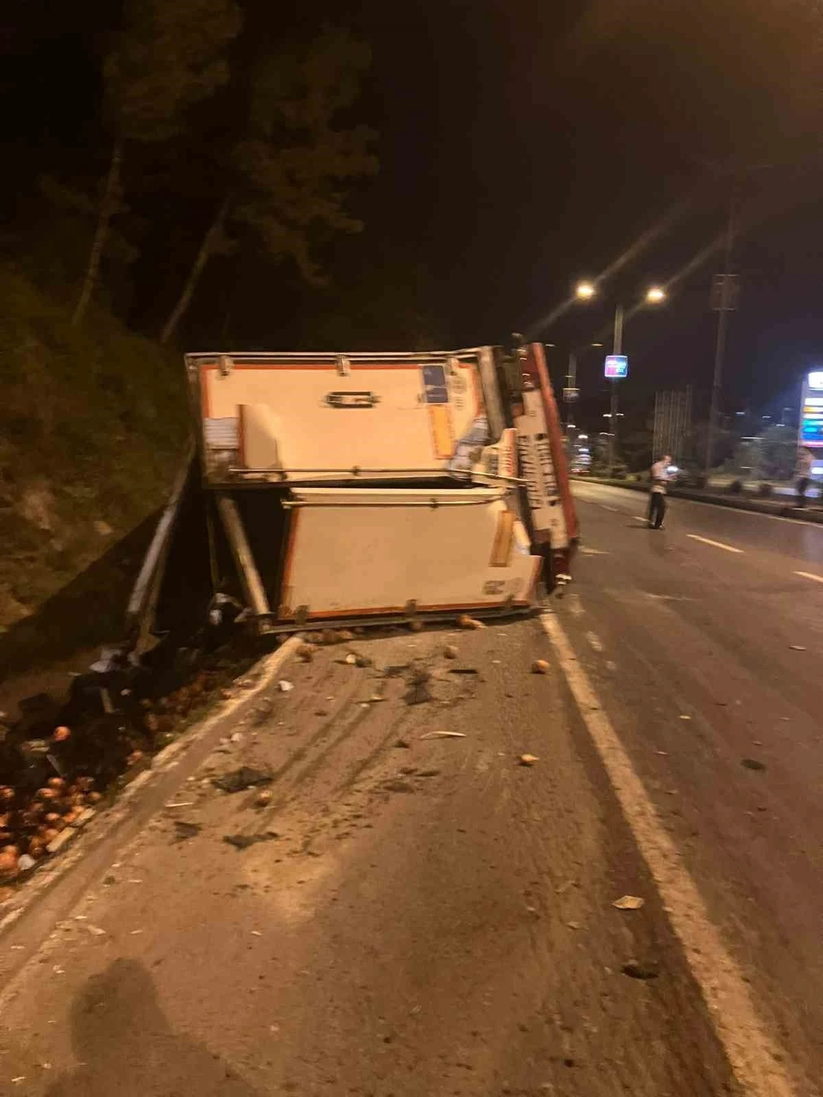 Hatay’da park halindeyken freni boşalan tır şarampole devrildi. Kazada tırdan yola nar döküldü.