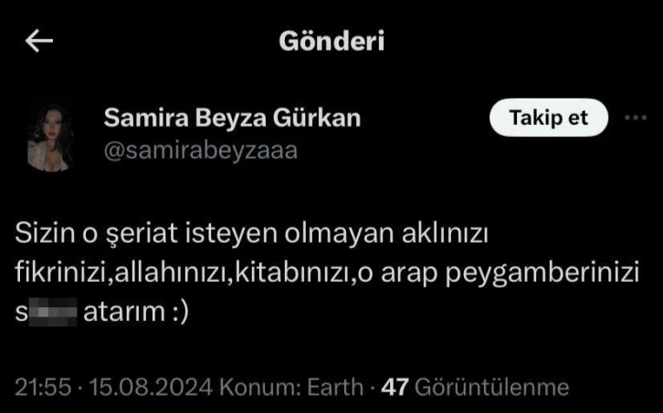 Edinilen bilgiye göre, sosyal medya hesapları üzerinden “sizin o şeriat isteyen olmayan aklınızı, fikrinizi, allahınızı, kitabınızı, o arap peygamberinizi s.... atarım:)” şeklinde ağza alınmayacak hakaretler eden ve uyuşturucu madde kullanımını özendirecek paylaşımlar yapan Samira Beyza Gürkan (22) geçtiğimiz günlerde Sivas Emniyet Müdürlüğü Siber Suçlarla Mücadele Şube Müdürlüğü ekipleri tarafından yapılan yer tespit çalışmasının ardından Narkotik ve Güvenlik Şube Müdürlükleri ekipleri tarafından gözaltına alınmıştı. Şüpheli, "uyuşturucu madde kullanımını özendirme, halkın bir kesiminin benimsediği dini değerleri alenen aşağılama" suçlarından adli makamlara sevk edilerek çıkarıldığı mahkemece tutuklanarak cezaevine gönderildi.