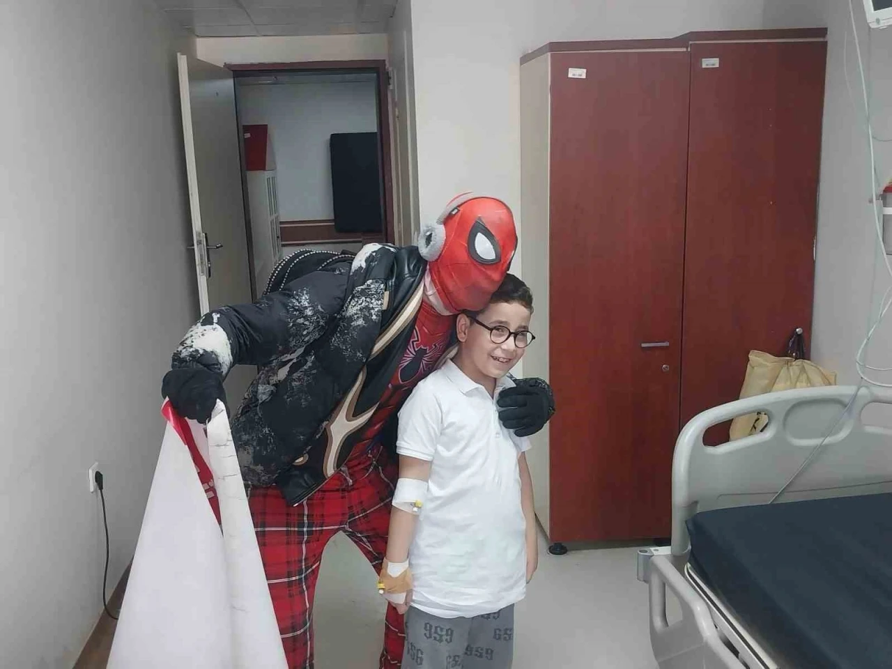 Türkiye’yi gezerek çocuklara moral veren İzmirli "Pijamalı Spiderman" Ayaz Salih Koç, 63. durağı olan Erzurum’da Atatürk Üniversitesi Araştırma Hastanesi’nde yatan minik hastaları ziyaret etti. Çocukların umut ve sevincine ortak olan Koç, hayalini gerçekleştirmeye devam ediyor.