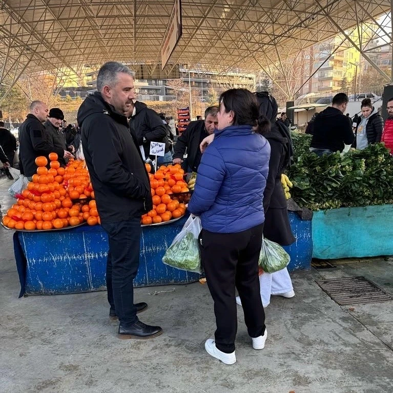 Başkan Çetin, pazar alanındaki vatandaş ve pazarcı esnafıyla bir araya gelerek sohbet etti. Sık sık pazar alanlarını ziyaret ederek, alışveriş yapan vatandaşlarla ve esnafla bir araya geldiklerini belirten Başkan Ertuğrul Çetin, "Zabıta Müdürlüğü ekiplerimizle birlikte hemşehrilerimizin, sağlıklı ve güvenli gıdaya ulaşabilmeleri için sık sık denetimlerde bulunuyoruz. Denetimlerimizin yanı sıra alışveriş yapan vatandaşlarımızla sohbet ediyor, esnaflarımızla da selamlaşıyoruz. Alanın da satanın da memnun olduğu pazarlar için çalışmaya, gayret etmeye devam edeceğiz" dedi.