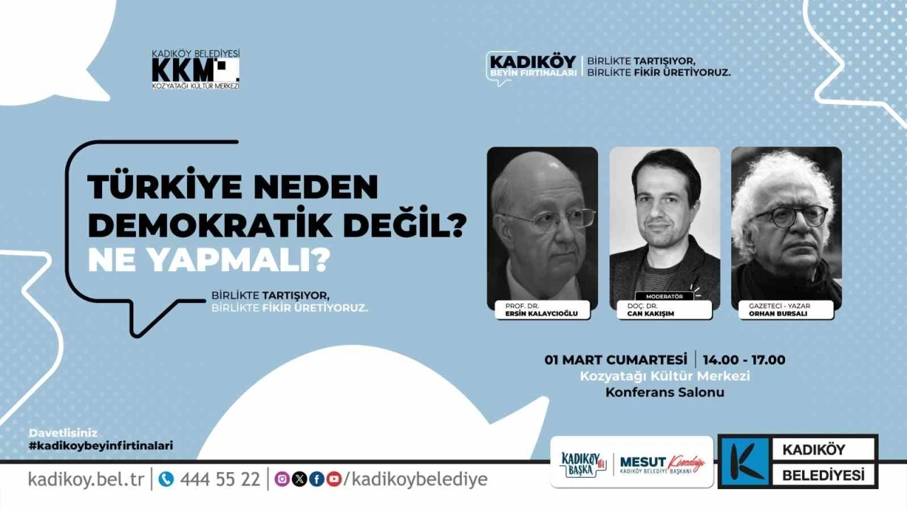 Kadıköy Belediyesi ve İdeaPolitik Enstitü tarafından Türkiye’nin güncel sorunlarına çözüm aramak amacıyla düzenlenecek olan "Kadıköy Beyin Fırtınaları" başlıklı panel dizisi başlıyor. Kadıköy Belediyesi ve İdeaPolitik Enstitü iş birliğiyle düzenlenen "Kadıköy Beyin Fırtınaları" panel dizisi, 1 Mart’ta başlıyor. Mart ayı boyunca her hafta sonu Kadıköy Belediyesi Kozyatağı Kültür Merkezi’nde gerçekleştirilecek panellerde, Türkiye’nin toplumsal meseleleri ele alınacak. Etkinlikler, katılımcıların fikir ve görüşleriyle aktif olarak katkı sunabileceği interaktif bir tartışma ortamı oluşturmayı hedefliyor. Serinin ilk paneli, "Türkiye Neden Demokratik Değil? Ne Yapmalı?" başlığıyla düzenlenecek. 1 Mart Cumartesi günü 14.00-17.00 saatleri arasında gerçekleşecek etkinliğin moderatörlüğünü, İdeaPolitik Genel Direktörü ve siyaset bilimci Doç. Dr. Can Kakışım üstlenecek. Panelde, Prof. Dr. Ersin Kalaycıoğlu ve gazeteci Orhan Bursalı, Türkiye’de demokrasinin karşı karşıya olduğu sorunları ve muhtemel çözüm yollarını tartışacak. Panel dizisi kapsamında 8 Mart, 16 Mart ve 23 Mart tarihlerinde farklı temalarda oturumlar gerçekleştirilecek.