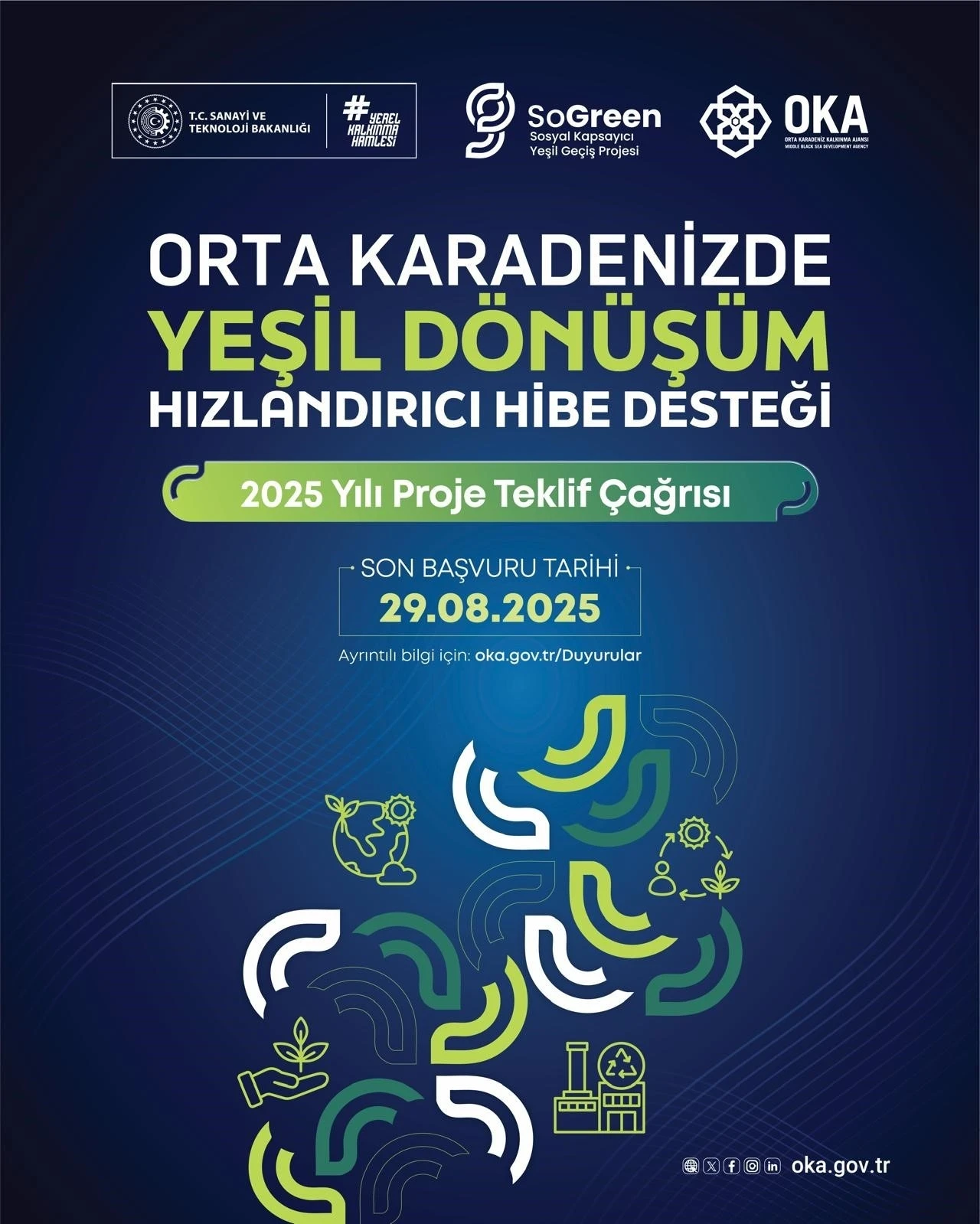 Sanayi ve Teknoloji Bakanlığı Kalkınma Ajansları Genel Müdürlüğü ile Dünya Bankası iş birliğinde yürütülen Türkiye Sosyal Kapsayıcı Yeşil Geçiş Projesi (SoGreen) kapsamında TR83 Bölgesi’ni kapsayan önemli bir adım atıldı. Orta Karadeniz Kalkınma Ajansı (OKA) tarafından yürütülecek olan "Orta Karadeniz’de Yeşil Dönüşüm" Hızlandırıcı Hibe Desteği Programı, 3 Temmuz 2025 tarihi itibarıyla ilan edildi.