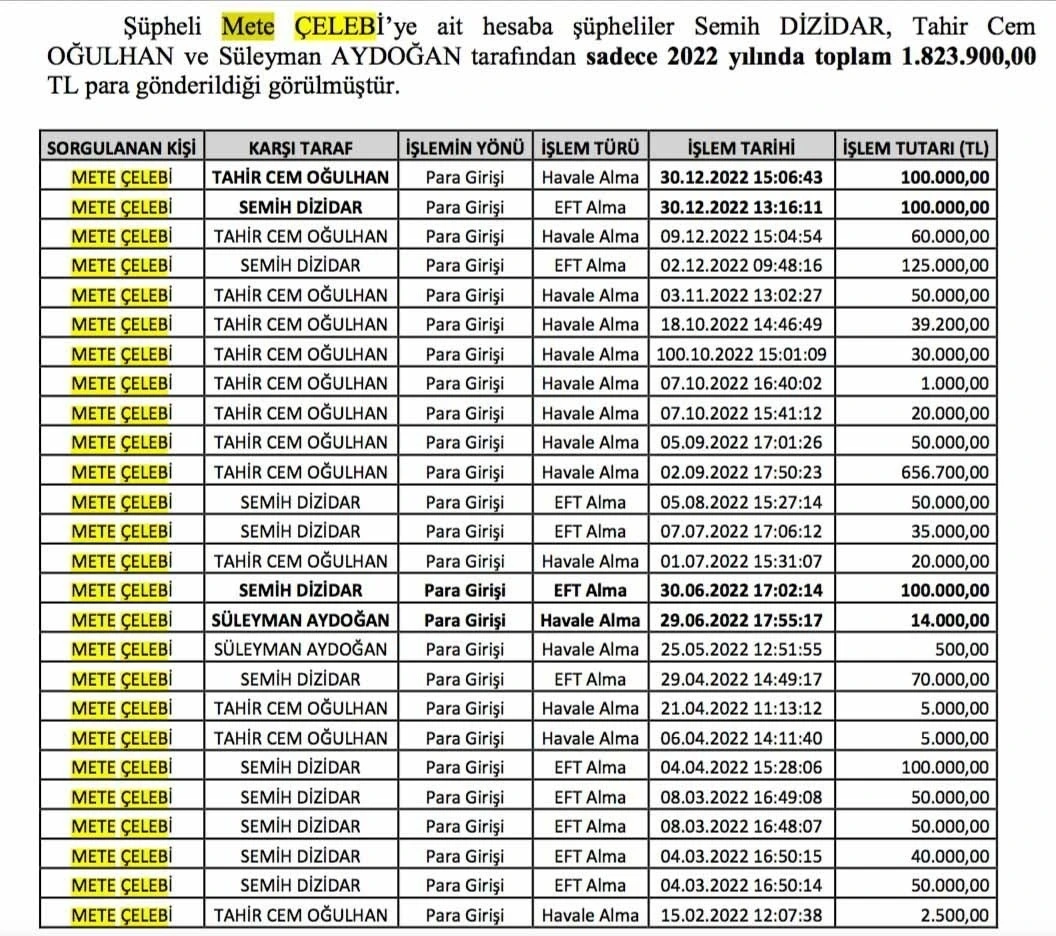 Adana Emniyet Müdürlüğü Kaçakçılık ve Organize Suçlar Şube Müdürlüğü ekipleri Adana Büyükşehir Belediyesi’nde "Reklam ihalelerine fesat karıştırma, rüşvet ve yolsuzluk" olayının gerçekleştiği yönünde 18 Aralık 2023’te operasyon gerçekleştirmişti. Operasyonda Başkan Karalar’ın başdanışmanı Mürüvvet Sızlı, Spor Hizmetleri Şube Müdürü Yüşa Davarcı, geri destek memuru Mehmet İlker Utuş, Eylül Ajans sahibi Tahir Cem Oğulhan, ajans sahipleri Süleyman Aydoğan, Semih Dizidar ile dönemin CHP Gençlik Kolları Başkanı Mete Çelebi’nin de aralarında olduğu 10 kişi gözaltına alınmış, şüphelilerden 5 kişi tutuklanmıştı. Mete Çelebi hakkındaki iddialar fezlekede