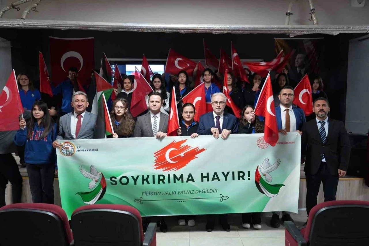 Millî Eğitim Bakanlığı’nın başlattığı çağrıya uyarak, Muğla genelindeki tüm okullarda "Soykırıma Hayır" temasıyla Filistin Farkındalık Etkinlikleri eş zamanlı olarak düzenlendi. "Filistin Halkı Yalnız Değildir" mesajının verildiği etkinlikler, Filistin’de yaşanan insanlık dramına karşı toplumsal bilinci artırmayı hedefledi. Muğla’daki programların en anlamlı duraklarından biri olan Muğla Gazi Anadolu Lisesi’ndeki programa ilgi büyük oldu. Etkinliğe, Millî Eğitim Müdürü Emre Çay, Muğla İl Müftüsü Dr. Rüstem Can ve İlçe Millî Eğitim Müdürü İdris Kömürcü katılarak öğrencilerle bir araya geldi. Öğrenciler, Filistin’de yaşananlara dikkat çekmek amacıyla hazırladıkları anlamlı konuşmalar ve duygu dolu paylaşımlarla salondakilere duygusal anlar yaşattı. Programın sonunda, İl Müftüsü Dr. Rüstem Can tarafından Filistin’de hayatını kaybeden masum insanlar için yürekten bir dua okundu. Millî Eğitim Müdürü Çay: "Vicdanı diri tutmak hepimizin sorumluluğu"