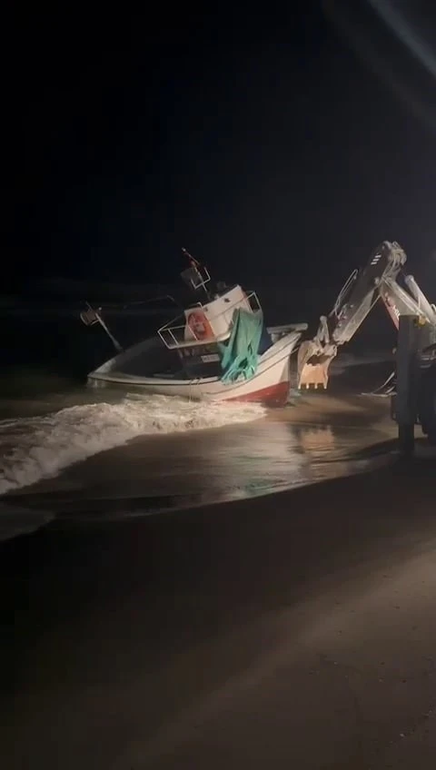 Sakarya’nın Karasu ilçesinde Sakarya Nehri ağzına girmeye çalışan 8 metrelik balıkçı teknesi karaya oturdu. Rüzgar ve dalgaların etkisiyle parçalanma tehlikesi geçiren tekne, iş makinesi yardımıyla kurtarıldı.