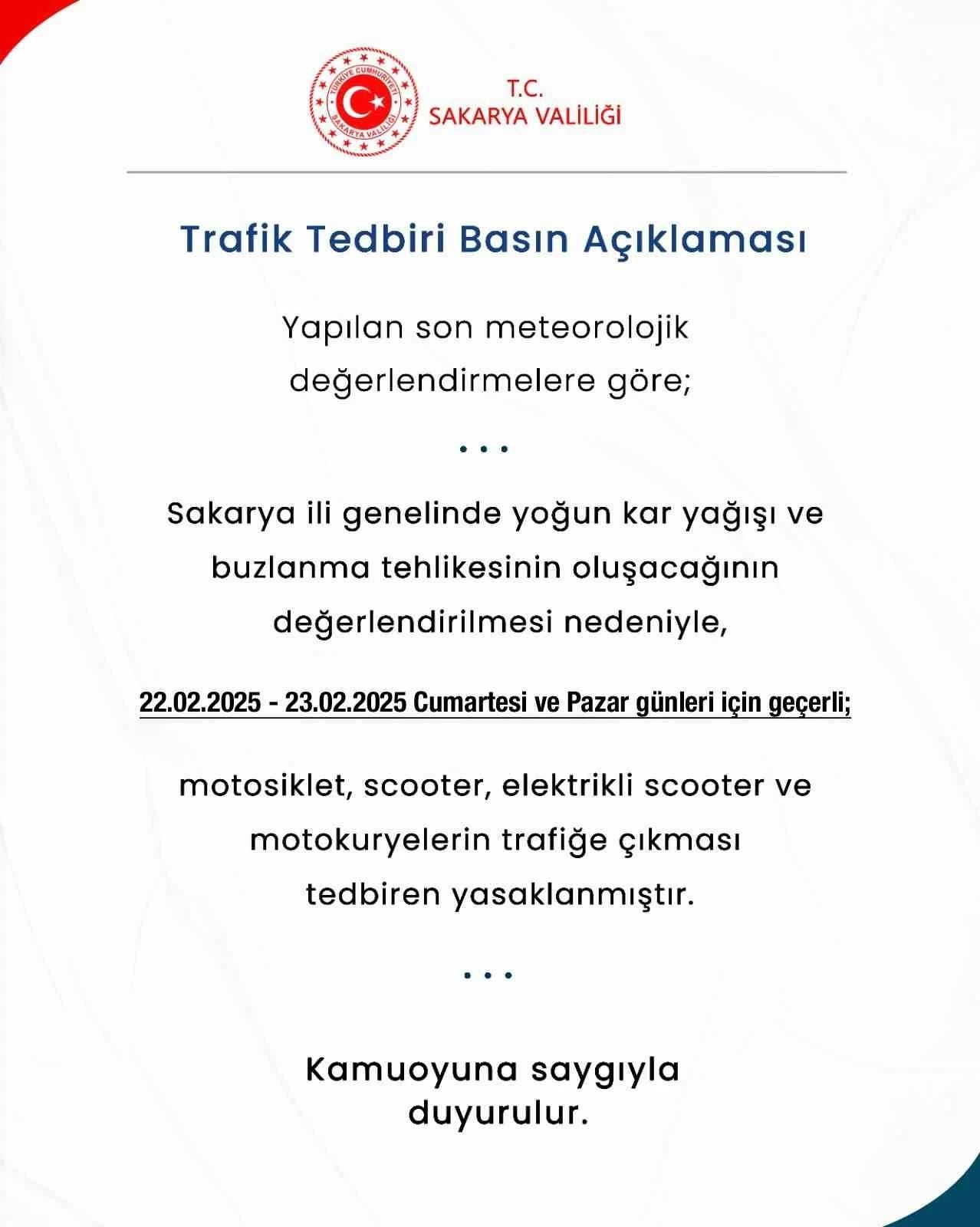 Konuya ilişkin Sakarya Valiliği tarafından yapılan yazılı açıklamada, "Yapılan son meteorolojik değerlendirmelere göre; Sakarya ili genelinde yoğun kar yağışı ve buzlanma tehlikesinin oluşacağının değerlendirilmesi nedeniyle, 22.02.2025-23.02.2025 Cumartesi ve Pazar güleri için geçerli; motosiklet, scooter, elektrikli scooter ve motokuryelerin trafiğe çıkması tedbiren yasaklanmıştır. Kamuoyuna saygıyla duyurulur" denildi.