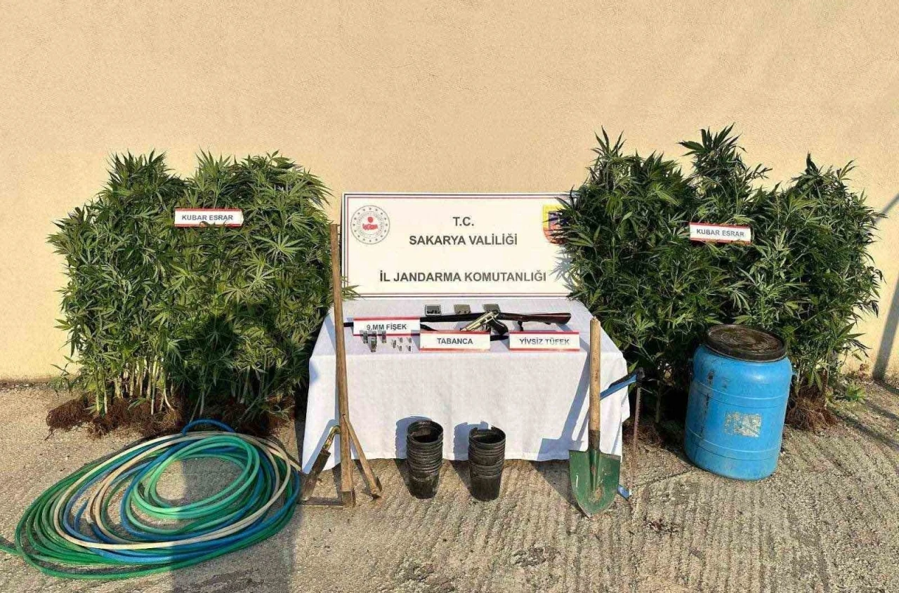Sakarya İl Jandarma Komutanlığı ekipleri sorumluluk bölgesinde uyuşturucu ticaretinin önlenmesine yönelik çalışmalarına devam ediyor. Bu çerçevede Hendek ilçesi Çobanyatak Mahallesi’nde, C.E. (52) isimli şahsın evine ve eklentilerine yönelik yapılan aramalarda (147) kök kenevir bitkisi, 1 av tüfeği, 6 adet av tüfeği fişeği, 1 kurusıkı tabanca, 6 adet kurusıkı fişeği, 3 cep telefonu ile birlikte kenevir yetiştiriciliğinde kullanıldığı değerlendirilen 30 saksı, 2 çapa, 1 kürek, 1 bahçe bıçağı, 1 testere, 50 metre sulama hortumu ve 1 fıçı bidon ele geçirildi. Operasyonda yakalanan şahıs adli işlemlerinin ardından tutuklanarak cezaevine gönderildi.
