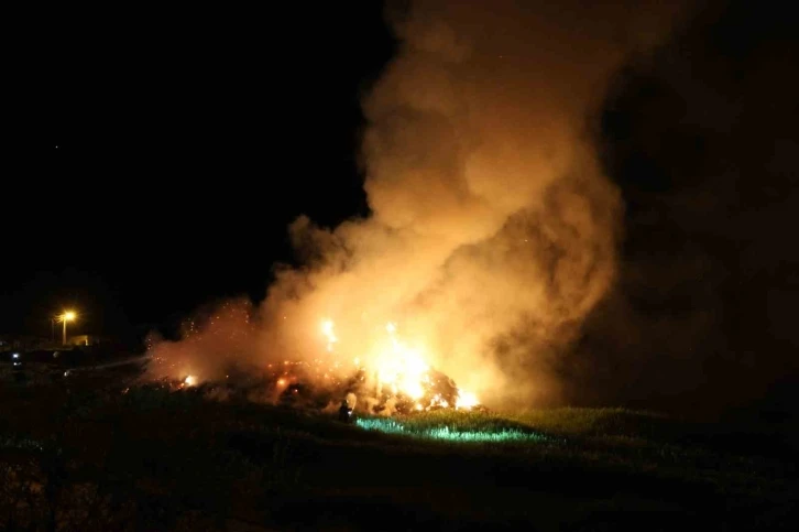 Kahramanmaraş’ta çıkan yangında saman balyaları alev alev yandı.