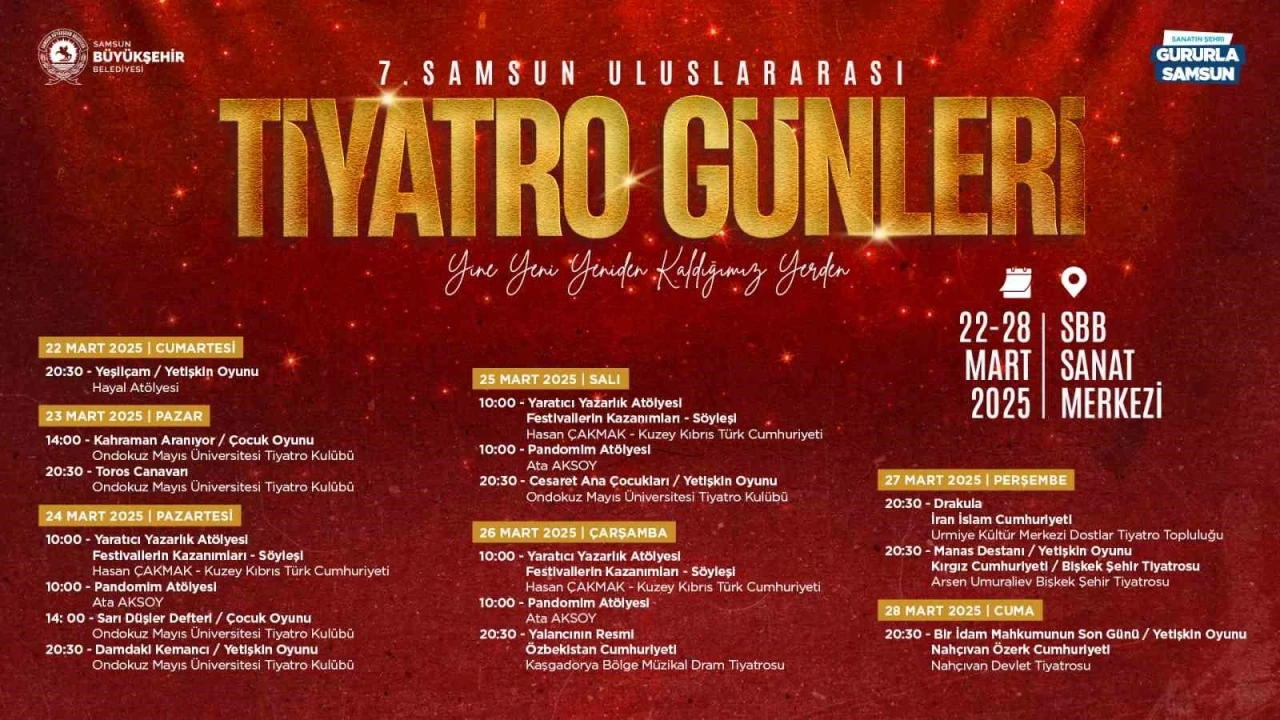 Samsun’u her alanda olduğu gibi sanatsal ve kültürel faaliyetlerle de Türkiye’nin önder şehirlerinden biri yapma hedefiyle çalışmalarını sürdüren Samsun Büyükşehir Belediyesi tarafından 7. Uluslararası Tiyatro Günleri başlıyor. 7.Uluslararası Tiyatro Günleri, 22 Mart Cumartesi günü saat 20.30’da Hayal Atölyesi tarafından sahnelenecek "Yeşilçam" adlı oyunla başlıyor. Ardından 23 Mart Pazar günü saat 14.00’te Ondokuz Mayıs Üniversitesi Tiyatro Kulübü tarafından "Kahraman Aranıyor" adlı çocuk oyunu, saat 20.30’da ise "Toros Canavarı" adlı yetişkin oyunu izleyicilerle buluşacak. 24 Mart Pazartesi günü ise 4 farklı etkinlik düzenlenecek. Saat 10.00’da, ünlü yazar Hasan Çakmak söyleşi programı ile vatandaşlarla bir araya gelirken, aynı saatte Ata Aksoy’un "Pandomim Atölyesi" de gerçekleşecek. Saat 14.00’te ise Ondokuz Mayıs Üniversitesi Tiyatro Kulübü tarafından "Sarı Düşler Defteri" adlı çocuk tiyatrosu sahnelenecek. Etkinliğin akşam kısmında ise saat 20.30’da "Damdaki Kemancı" adlı yetişkin oyunu izleyicilerle buluşacak. Etkinlikler SBB Sanat Merkezi’nde ücretsiz olarak gerçekleşecek