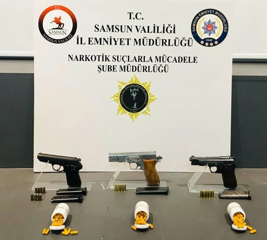 Samsun’da polis tarafından 2 kişinin ikametinde yapılan aramada, 3 adet ruhsatsız tabanca ve uyuşturucu hap ele geçirildi.