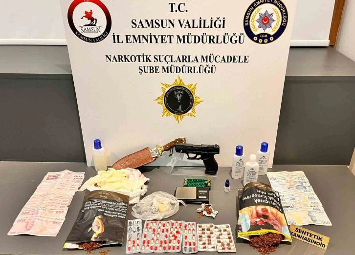 Edinilen bilgiye göre, Samsun Emniyet Müdürlüğüne bağlı resmi ve sivil ekipler, uyuşturucu madde ticareti, nakli veya depolanması faaliyetlerini yürüten şahıs ve şahıslara yönelik olarak yapılan çalışmalar kapsamında İlkadım ve Atakum ilçelerinin farklı mahallelerinde uyuşturucu uygulaması düzenledi. Şüpheli 7 şahsın üzerinde, araçlarında ve ikametlerinde yapılan aramalarda, bin 654 adet sentetik ecza, 100 adet ecstasy hap, 270 gram sentetik kannabinoid, 29 gram sentetik kannabinoid hammaddesi, 390 ml aseton, 3 adet hassas terazi, 6 adet eldiven, 1 adet kurusıkı tabanca, 4,50 gram metamfetamin, 6 adet tabanca fişeği, 4 adet kurusıkı fişeği, 1 adet amaç dışı bıçak, 2 adet uyuşturucu madde kullanım aparatı, 2 bin TL sahte para ve uyuşturucu satışından elde edildiği değerlendirilen 8 bin 900 TL para ele geçirildi. Olayla ilgili 7 şahıs hakkında adli işlem başlatıldı.