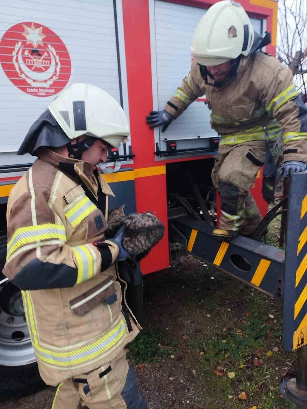 İzmir’in Beydağ ilçesinde sansardan korkup ağaca çıkan ve mahsur kalan kedi, itfaiye ekipleri tarafından kurtarıldı.