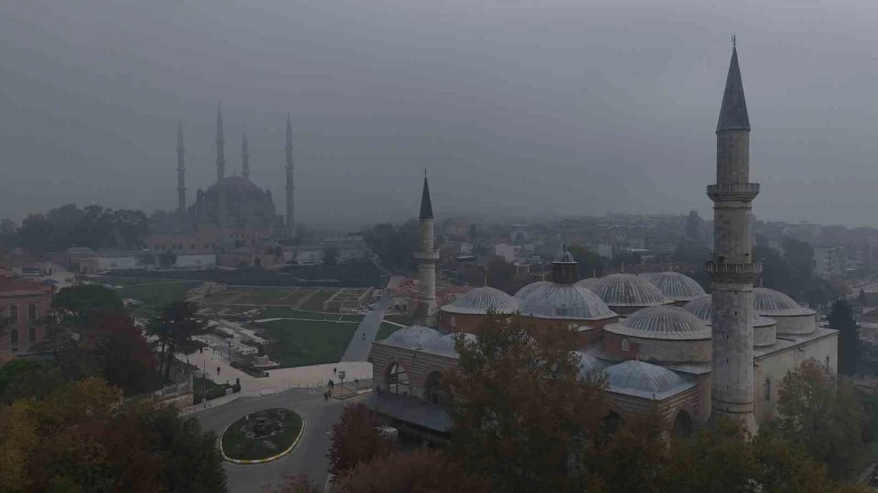 Edirne’de sabah saatlerinde etkili olan yoğun sis, tarihi yapıları adeta görünmez hale getirdi. Kentin simgesi Selimiye Camisi başta olmak üzere birçok tarihi eser sis bulutları arasında kayboldu.