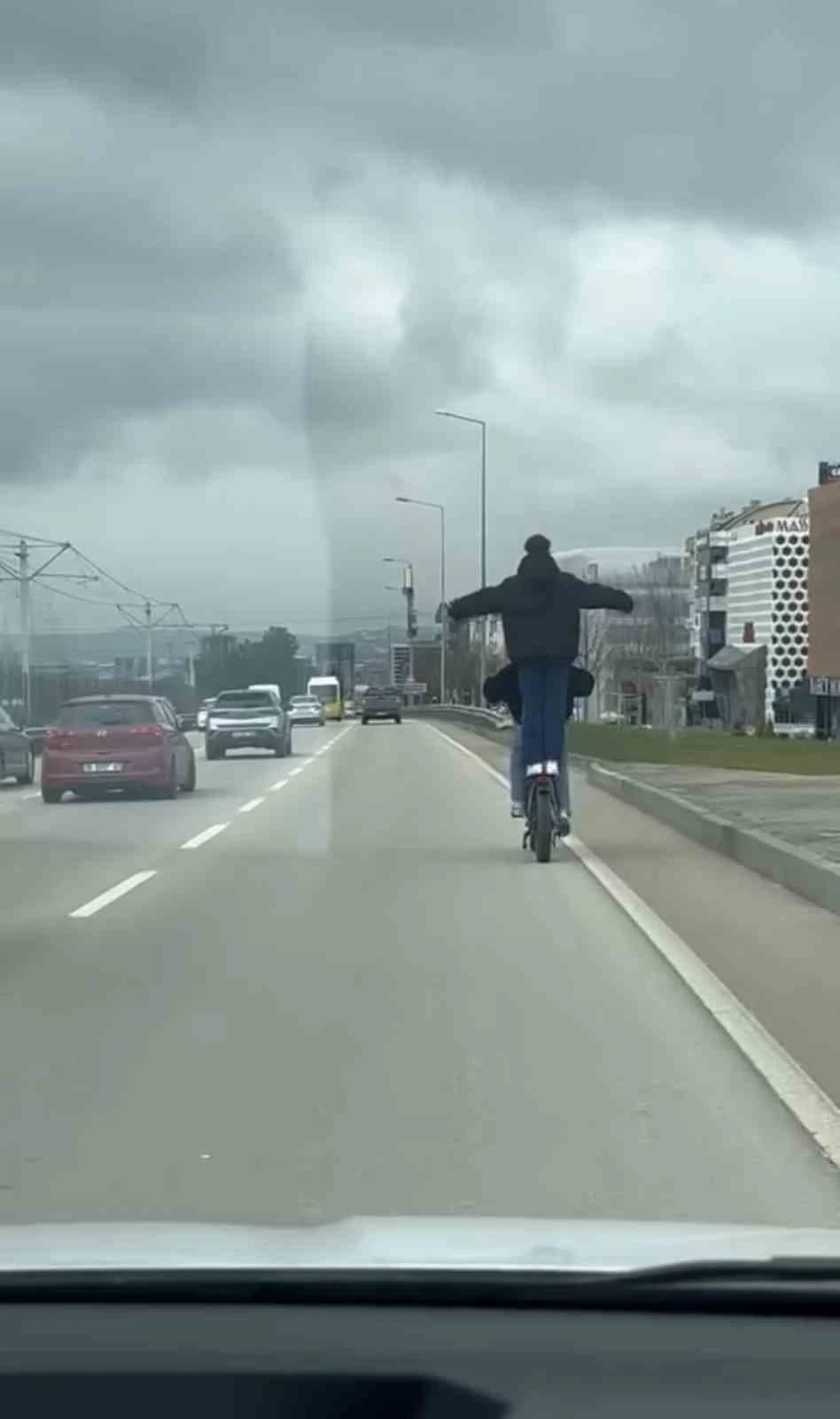 Gülümseten görüntüler merkez Nilüfer ilçesi İzmir Yolu Caddesinde kayda alındı. Bisiklet ile seyir halinde olan gencin arkasında bulunan yolcu bir anda kendisini kuş zannetti. Kollarını açtıktan sonra çırpan genç komik görüntüler oluşturdu. İlginç anlar, diğer sürücüler tarafından saniye saniye kaydedildi.