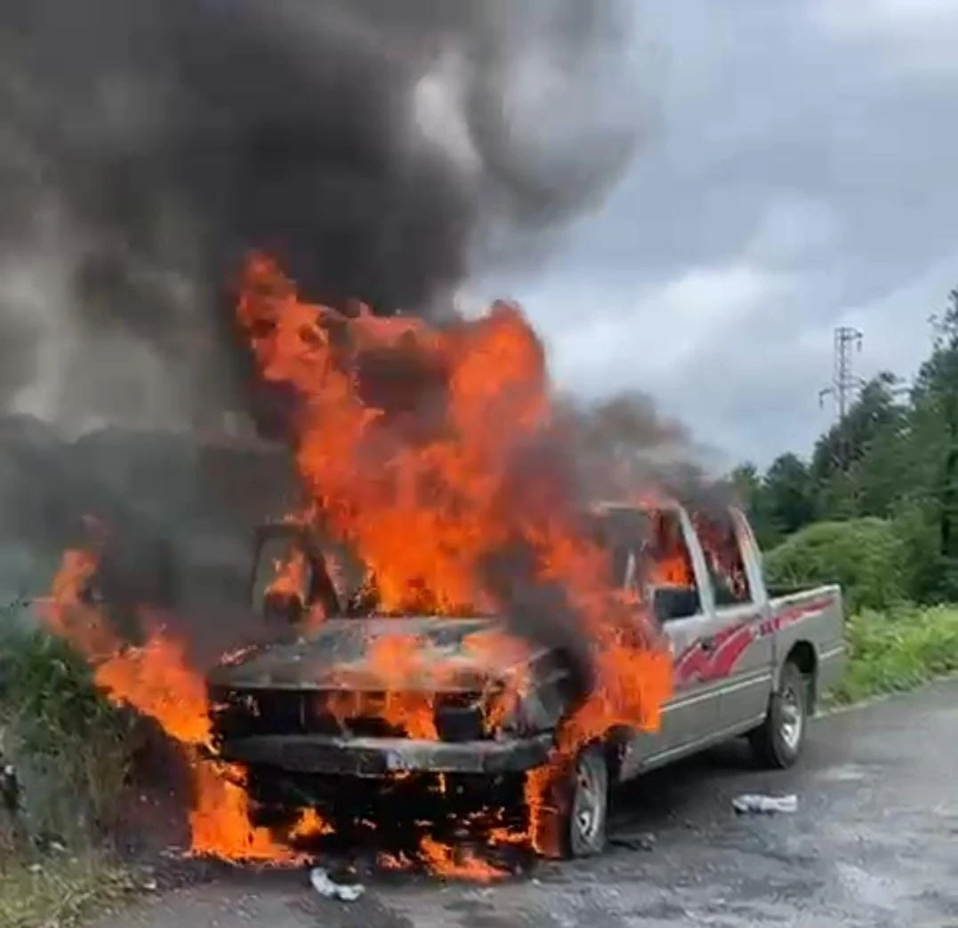 Rize’de seyir halindeyken alev alan kamyonetin sürücüsü, kendisini araçtan dışarıya atarak kurtuldu.