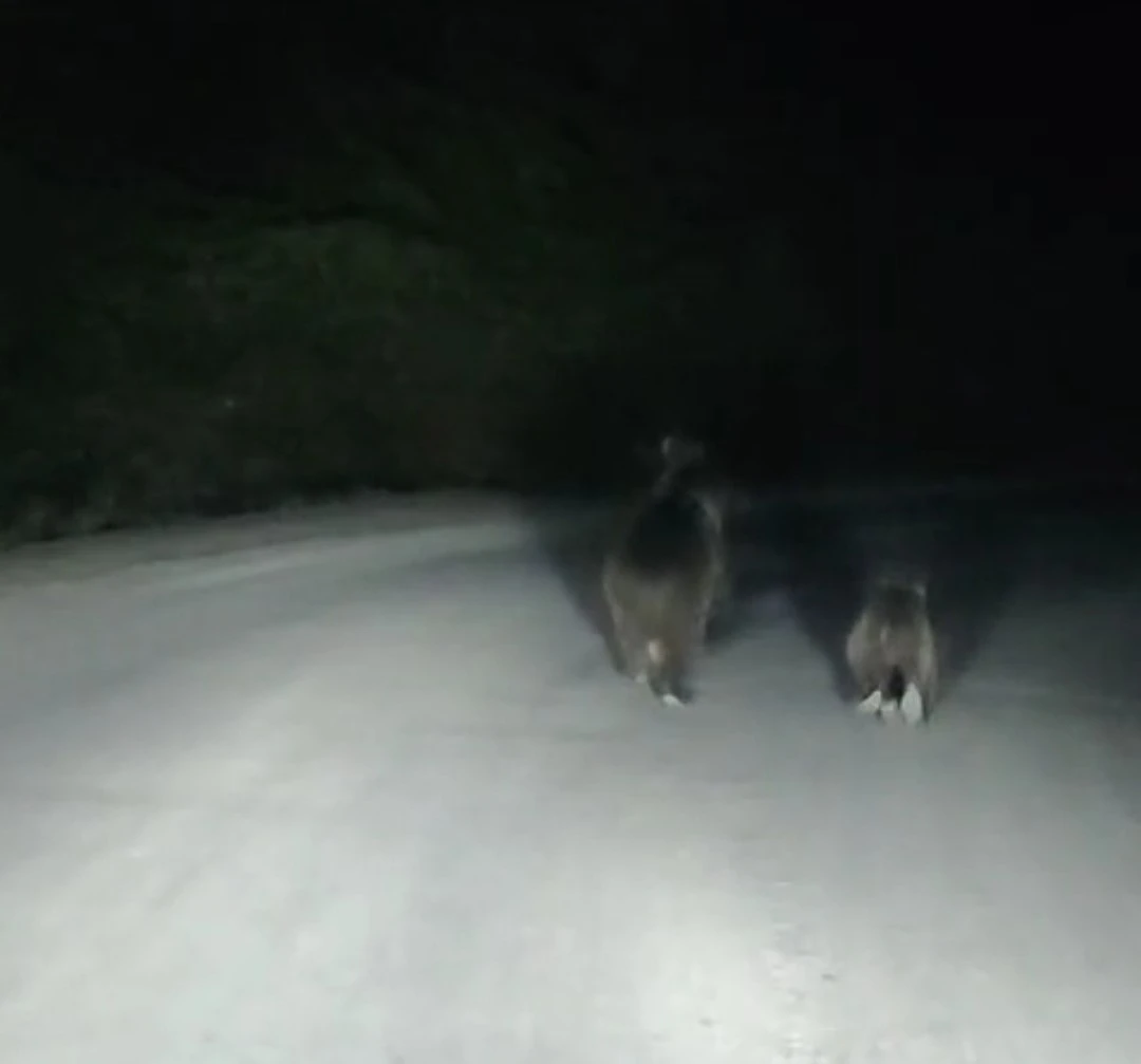 Bartın’ın Ulus ilçesi Ulukaya Kadıköyü grup yolu üzerinde otomobil ile seyir halinde bulunan bir vatandaş, yolda bulunan bir ayı ve yavrusunu gördü. Ayı ve yavrusu otomobilin ışıklarını görünce hızla kaçmaya başladı. Ayıları gören vatandaş ise cep telefonu kamerası ile o anları görüntüledi. Ayılar bir süre sonra ormana girerek gözden kayboldu.