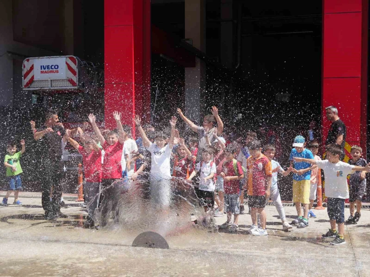 İtfaiye Müdürü Mehmet Ali Kahraman’ın da hazır bulunduğu ziyarette, itfaiye araçlarını ve itfaiye personelinin kullandığı aletleri inceleyen çocuklar daha sonra yangına müdahale tekniklerini uygulamalı öğrendi.