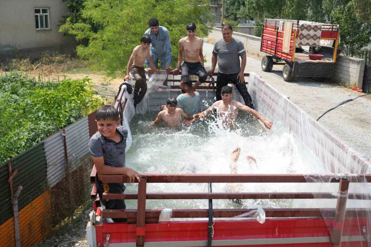 Muş’un Tabanlı köyünde yaşayan gençler, serinlemek için traktör römorkuna naylon serip su doldurarak yaptıkları havuzda keyifli dakikalar geçirdi.