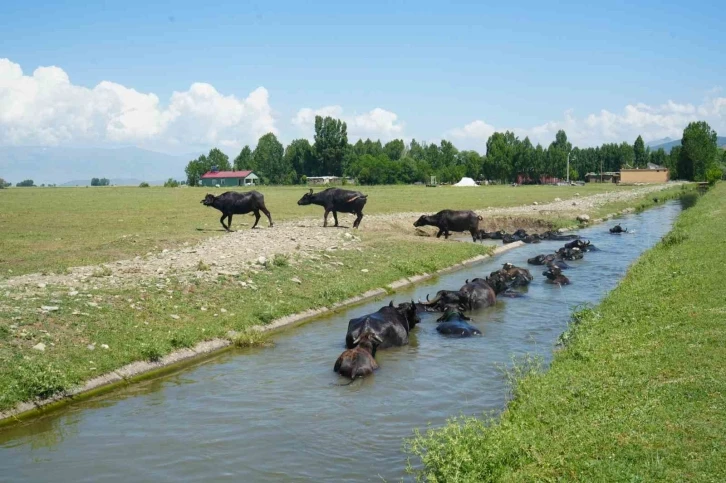 Muş’ta sıcaktan bunalan mandaların serinlemek için girdikleri Karasu Nehri ve göletlerdeki görüntüleri Afrika’yı aratmıyor.
