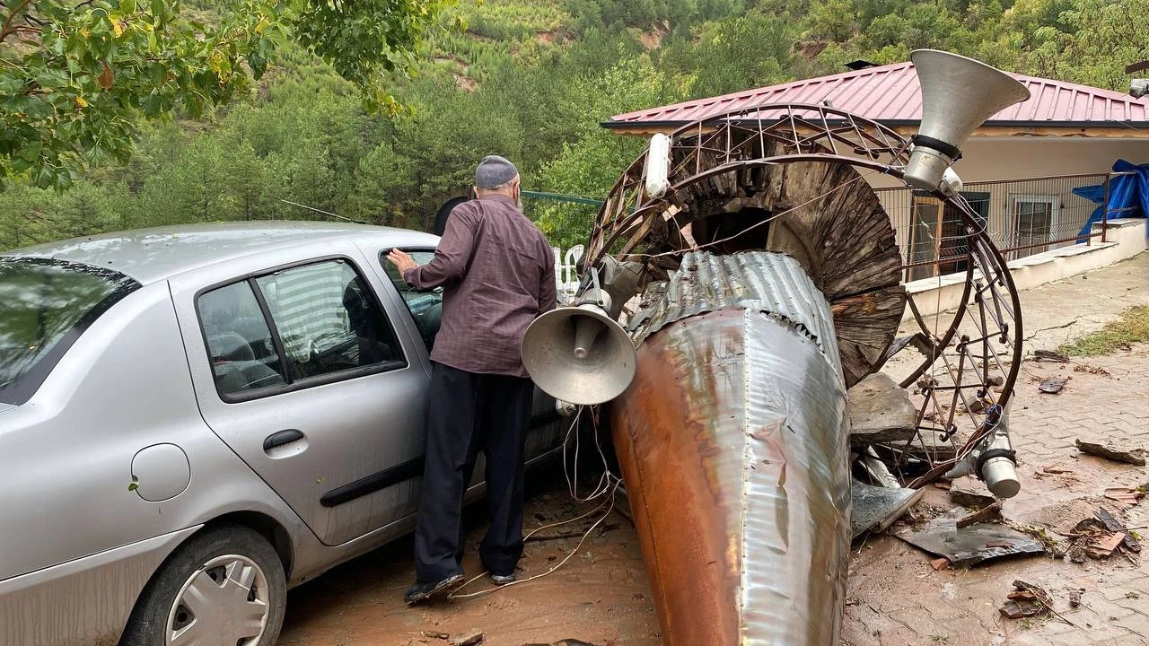Dün gece yarısı etkili olan sağanak ve fırtınaya dayanamayan caminin minaresi imam Abdulsamet Şahin’in otomobilinin üzerine doğru yıkıldı.
