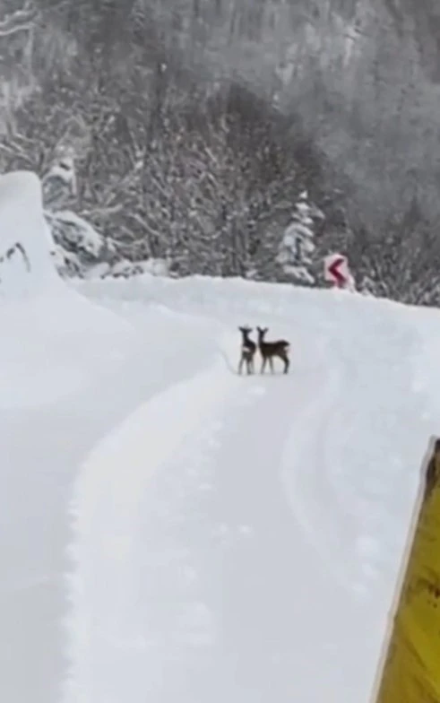Ekipler, kar kalınlığının yer yer 1 metreye ulaştığı bölgede iş makineleriyle yol açtığı sırada sürpriz misafirlerle karşılaştı. Ormanlık alandan yola çıkan karacalar, metrelerce karın içerisinde adeta birbirleriyle yarışarak koşmaya başladı. Karacaların kar üzerindeki sevinç dolu anları, çalışmaları sürdüren personeller tarafından saniye saniye kaydedildi.
