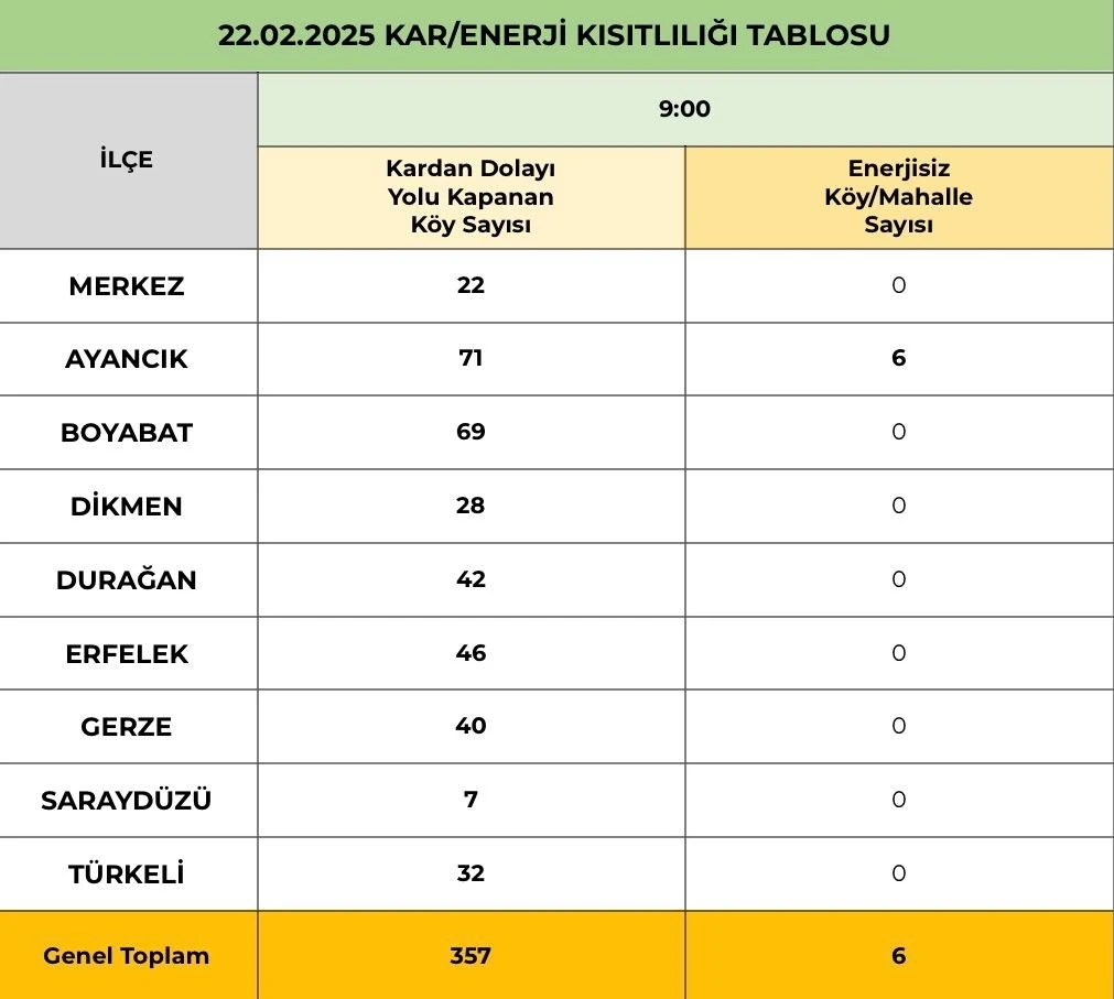 Sinop’un özellikle yüksek rakımlı ilçelerinde kar yağışı etkisini sürdürüyor. Valilikten yapılan açıklamada, etkili olan kar yağışı sebebiyle, Ayancık ilçesinde 71, Boyabat ilçesinde 69, Dikmen ilçesinde 28, Durağan ilçesinde 42, Gerze ilçesinde 40, Merkez 22, Erfelek ilçesinde 46, Türkeli ilçesinde 32, Saraydüzü ilçesinde 7 köy yolu olmak üzere toplamda 357 köy yolunun ulaşıma kapalı olduğu bildirildi. Sinop İl Özel İdaresi ekipleri, kapalı köy yollarının tekrardan ulaşıma açılması için çalışmalarını sürdürüyor.