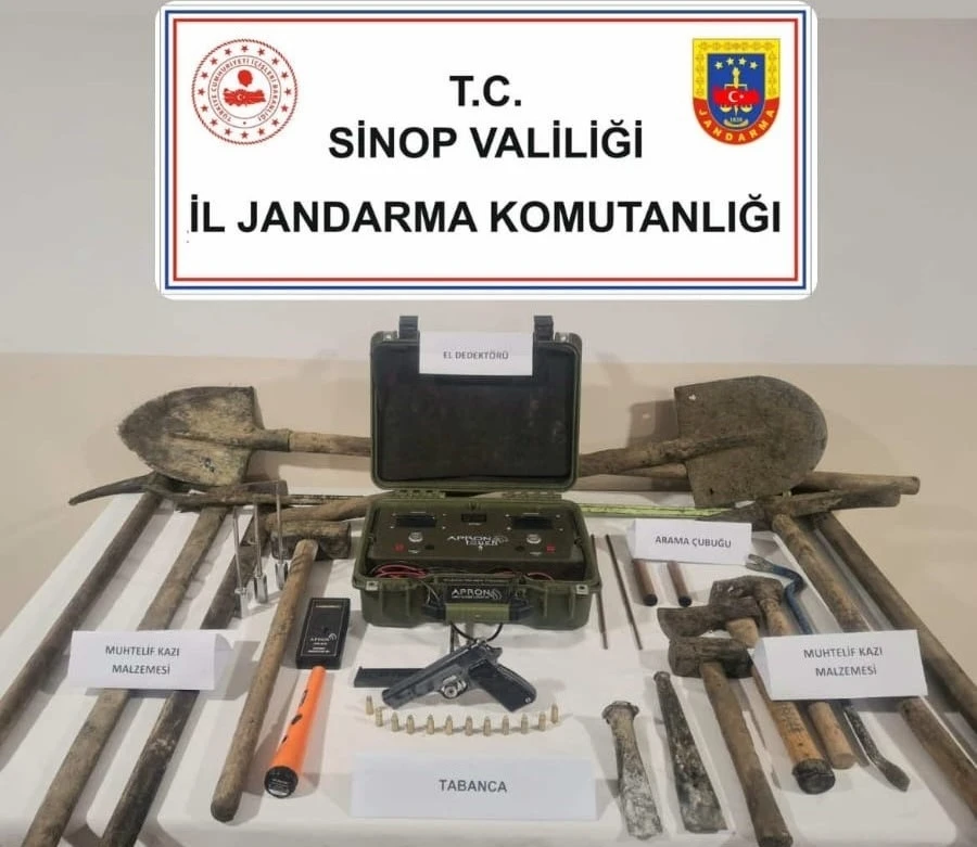 Sinop’un Erfelek ilçesinde İl Jandarma Komutanlığı ekipleri, ilçede kaçak kazı yapıldığı ihbarı üzerine çalışma başlattı. Sinop İl Jandarma Komutanlığınca kültür ve tabiat varlıklarını korumaya yönelik yapılan çalışmalar neticesinde bir bölgede kaçak kazı yaptığı tespit edilen 3 şüpheli şahıs, 1 adet tabanca, 26 parça kazı malzemesi ve teknik ekipman ile suçüstü yakalandı. Şüpheli şahıslar hakkında adli işlemler başlatıldı.