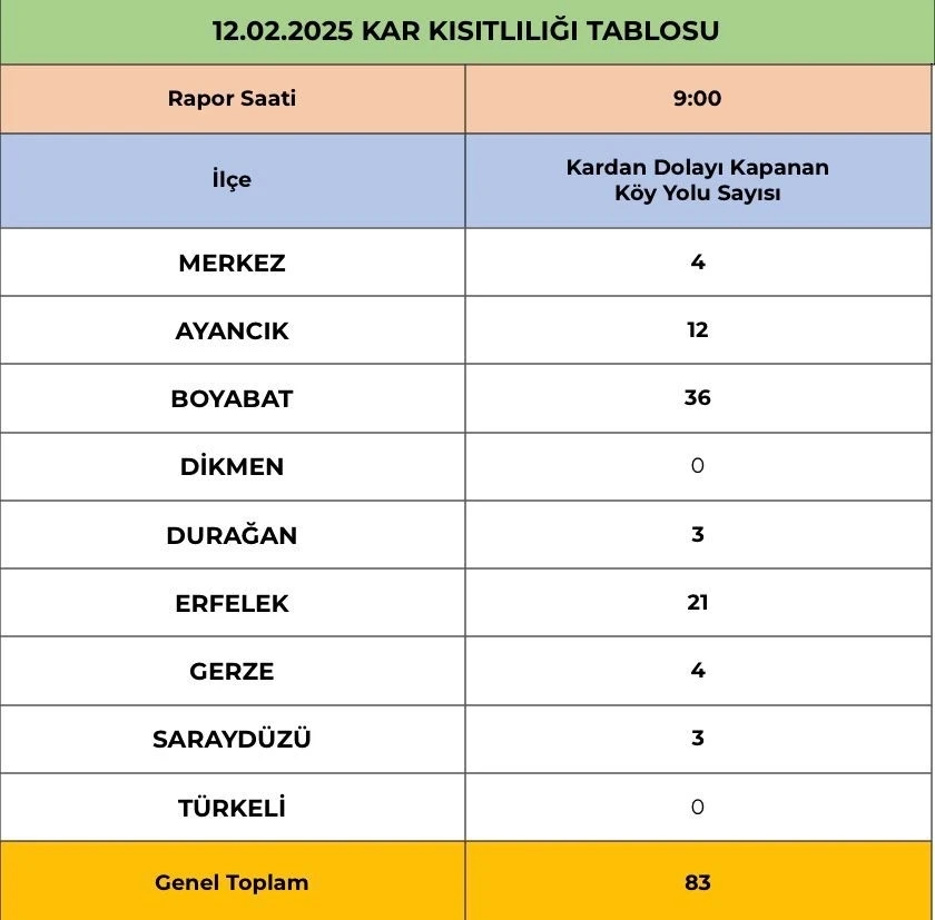 Sinop’ta yoğun kar yağışı nedeniyle Merkez ilçede 4, Ayancık’ta 12, Boyabat’ta 36, Durağan’da 3, Erfelek’te 21, Gerze’de 4 ve Saraydüzü’nde 3 olmak üzere toplam 83 köy ile ulaşım sağlanamıyor.