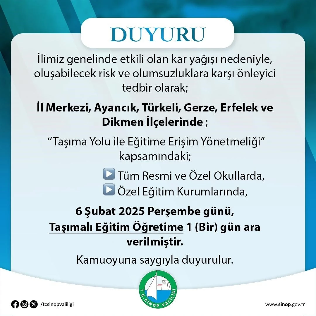 Sinop Valiliği’nden yapılan açıklamada, ‘’İlimiz genelinde etkili olan kar yağışı nedeniyle, oluşabilecek risk ve olumsuzluklara karşı önleyici tedbir olarak; il merkezi, Ayancık, Türkeli, Gerze, Erfelek ve Dikmen ilçelerinde; ‘Taşıma Yolu ile Eğitime Erişim Yönetmeliği’ kapsamındaki; tüm resmi ve özel okullarda, özel eğitim kurumlarında, 06 Şubat 2025 Perşembe günü, taşımalı eğitim- öğretime 1 gün ara verilmiştir’’ ifadelerine yer verildi.