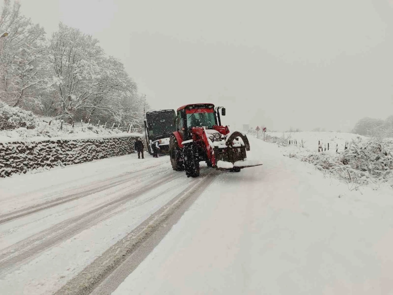 Sinop’ta soğuk hava yerini yoğun kar yağışına bıraktı. Kent genelinde etkisini artıran kar yağışı nedeniyle ulaşımda aksamalar yaşandı. Merkeze bağlı Mertoğlu köyünde bir yolcu otobüsü, kaygan yol nedeniyle kontrolden çıkarak yol kenarına kaydı. Otobüs, köylülerin traktör yardımıyla çekilerek kurtarıldı.