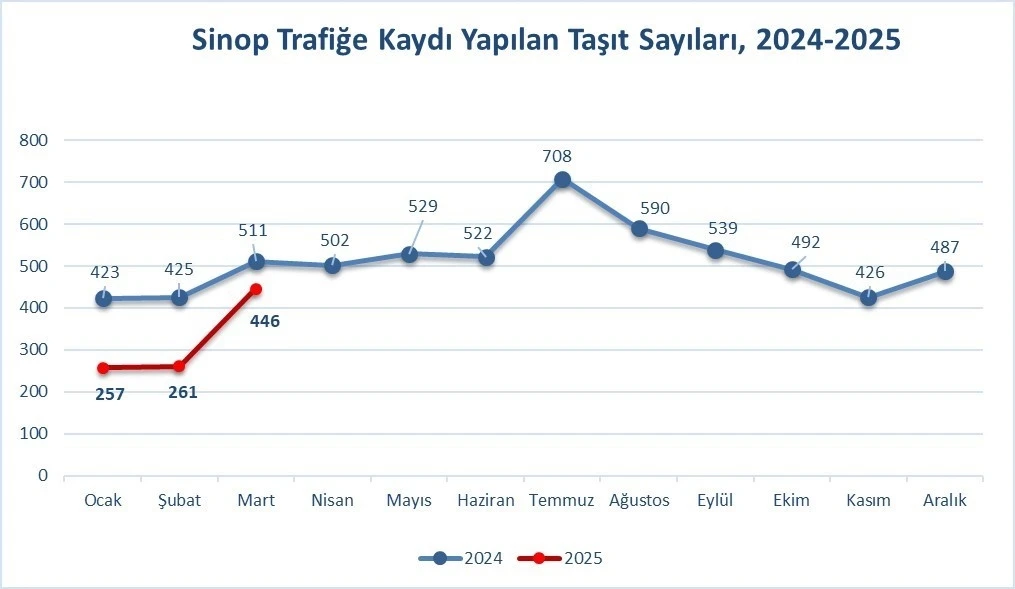 Sinop’ta Mart ayında 446 adet taşıtın trafiğe kaydı yapıldı. Trafiğe kaydı yapılan taşıt sayısı geçen aya göre 185 adet arttı. Sinop’ta Mart ayında 25 farklı otomobil markasından 123 adet aracın trafiğe kaydı yapıldı. Mart ayında bin 568 adet taşıtın da devri yapıldı.