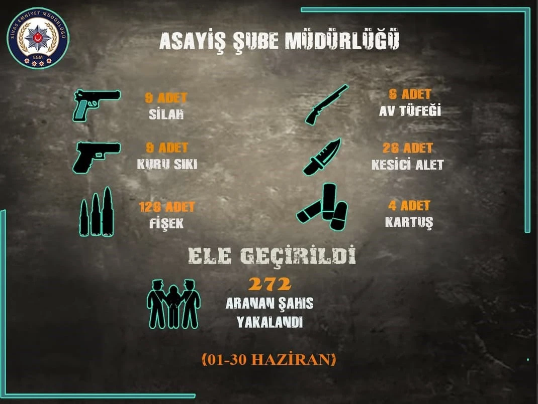 Sivas İl Emniyet Müdürlüğü, Asayiş Müdürlüğü ekiplerince 01-30 Haziran tarihleri arasında vatandaşın can ve mal güvenliğini temin etmek, meydana gelebilecek olayların önüne geçmek amacıyla birçok operasyon düzenlendi. Asayiş Şube Müdürlüğü ekiplerince gerçekleştirilen operasyonlarda; 9 adet silah, 6 adet av tüfeği, 9 adet kurusıkı tabanca, 128 adet fişek, 26 adet kesici alet ve 4 adet kartuş ele geçirildi. Ayrıca, çeşitli suçlardan aranan 272 şahıs da yakalandı.