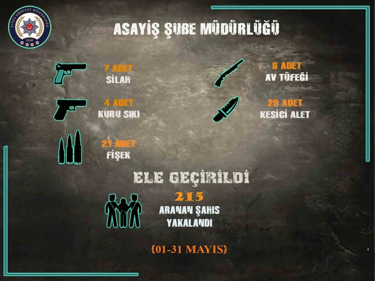 Sivas’ta Emniyet Müdürlüğü ekipleri tarafından 1-31 Mayıs tarihleri arasında yürütülen çalışmalar çerçevesinde uyuşturucu ve asayiş suçlarına yönelik gerçekleştirilen operasyonlarda çok sayıda suç unsuru ele geçirilirken, aranan 215 şahıs yakalandı.
