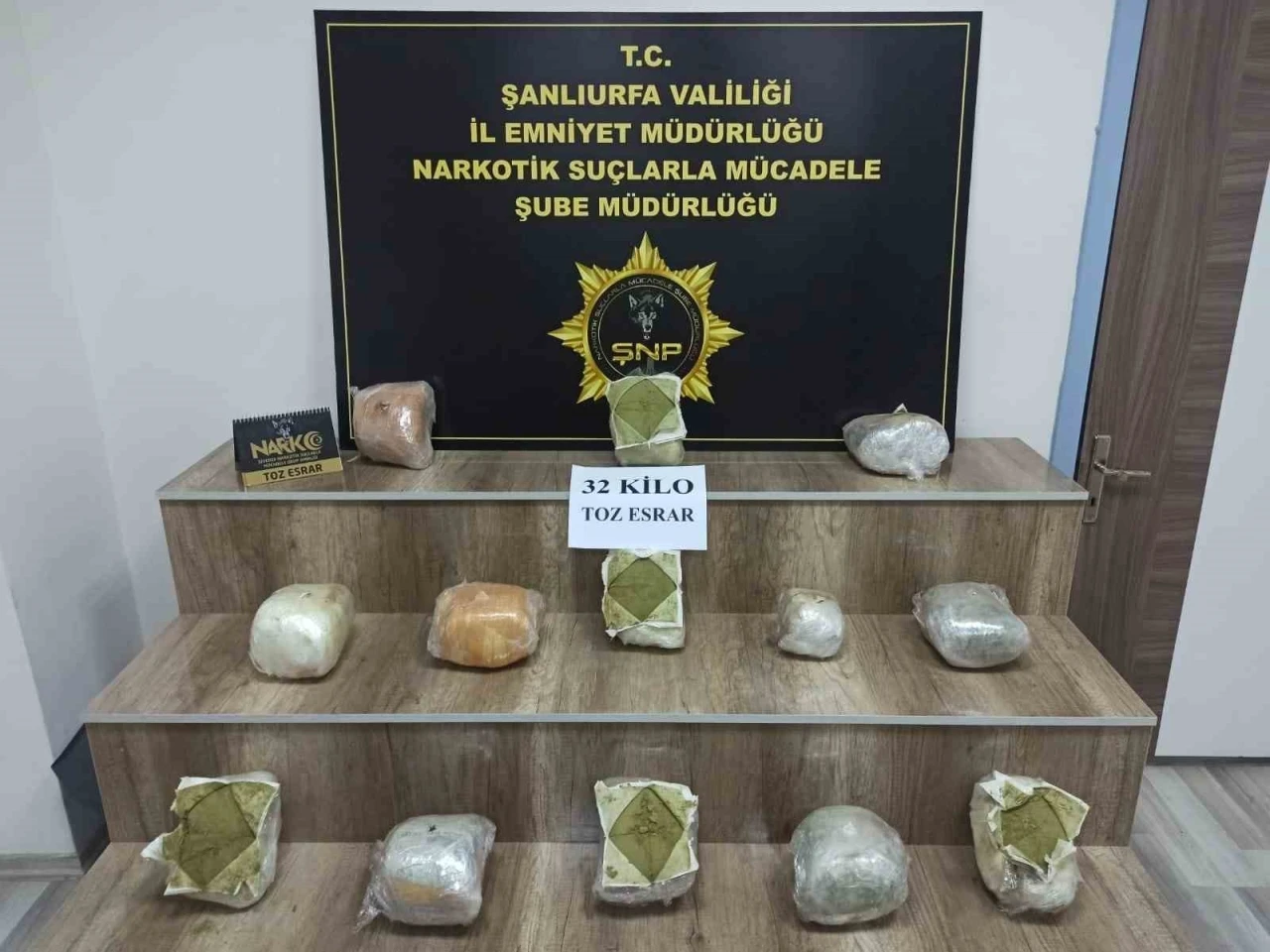 Edinilen bilgiye göre, Şanlıurfa İl Emniyet Müdürlüğü Narkotik Suçlarla Mücadele Şube Müdürlüğü ekipleri, şüphelendikleri bir tırı durdurdu. Tırın dorse kısmında arama yapan ekipler, 13 parça halinde paketlenmiş 32 kilogram toz esrar maddesi ele geçirdi. Gözaltına alınan 1 şahıs emniyete götürülürken, yaklaşık 160 bin vatandaşın tacirler tarafından zehirlenmesinin önüne geçildiği belirtildi.