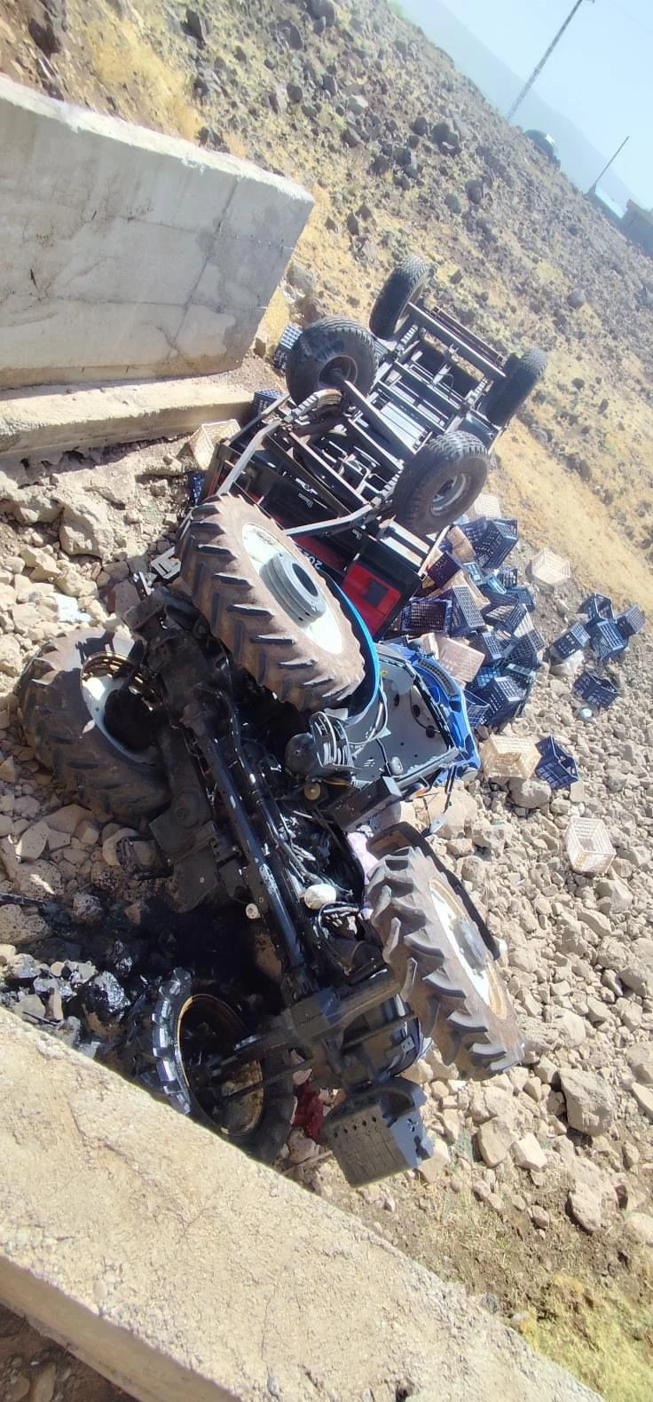 Şanlıurfa’nın Siverek ilçesinde domates yüklü traktör köprüden uçtu. Sürücü yaralanırken, araçtaki kasalar etrafa saçıldı.