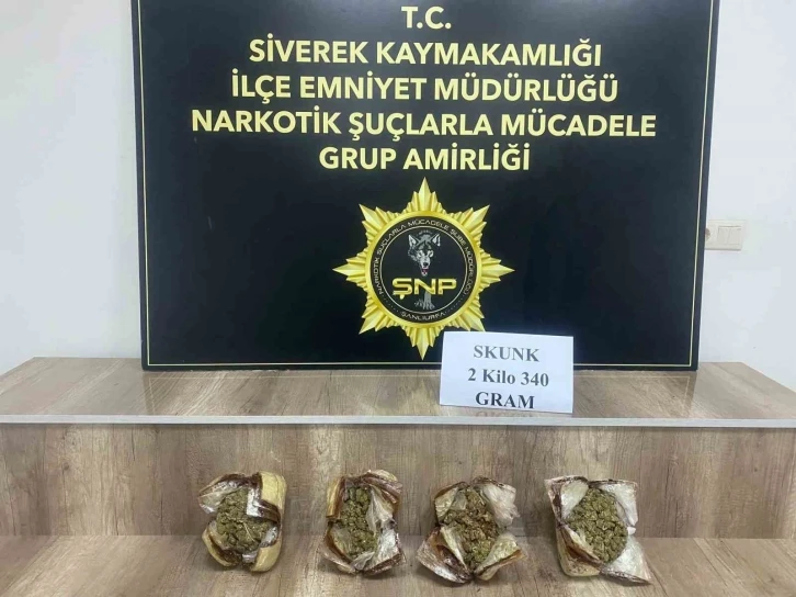 İlçenin Selimpınar Mahallesi uygulama noktasında durdurulan bir yolcu otobüsünde yapılan aramada, A.K. isimli yolcuya ait olduğu öğrenilen bir valizde 2 kilo 340 gram skunk maddesi ele geçirildi. A.K. emniyet ekiplerince uyuşturucu veya uyarıcı madde ticareti yapma veya sağlama suçundan gözaltına alındı.
