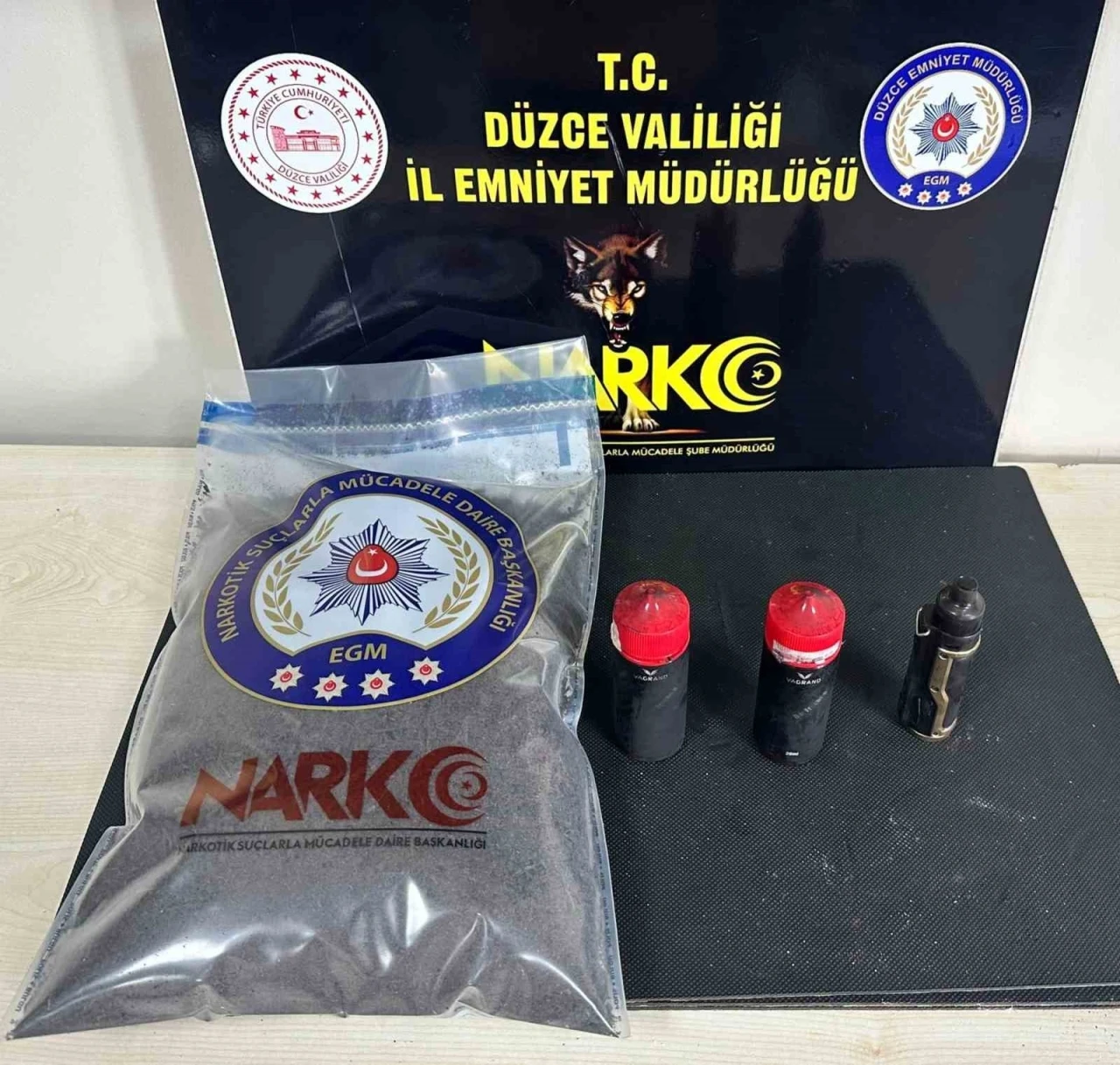 Düzce Cumhuriyet Başsavcılığı koordinesinde Narkotik Suçlarla Mücadele Şube Müdürlüğü ekiplerince yapılan çalışmalarda 3 parça halinde 210 gram sıvı sentetik kannabinoid maddesi ele geçirildi. Olayda 6 suç kaydı bulunan E.B. (21) gözaltına alındı. Hakkında "uyuşturucu madde ticareti yapmak" suçundan işlem yapılan şüpheli, Düzce Cumhuriyet Başsavcılığı tarafından sevk edildiği sulh ceza hakimliğince tutuklandı.