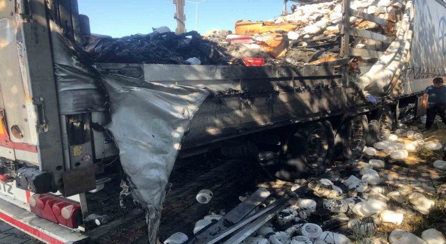 Denizli’nin Çardak ilçesinde şoförü uyuyan bidon yüklü tır, yoldan çıkması sonucu girdiği tali yolda evin bahçe duvarına çarptı. Büyük gürültünün koptuğu o anlarda alev alan tırda başlayan yangın kısa sürede söndürüldü.