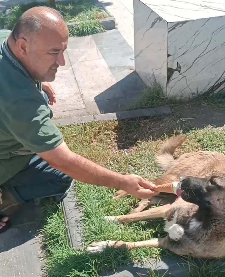 Sıcakların etkili olduğu Batman’da, sokak köpeği bir vatandaşın ikram ettiği dondurmayı geri çevirmedi.