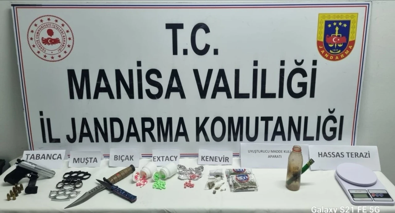 Manisa’nın Soma ilçesinde ’Uyuşturucu madde ticareti yapan şahıslara’ yönelik olarak Soma İlçe Jandarma Komutanlığı ekiplerince A.Ö.Y., Ş.S., G.K., A.Y.K. ve Y.K. isimli şahısların ikamet ve araçlarında yapılan adli aramada; 1 adet 9 mm ruhsatsız tabanca, 94 adet uyuşturucu hap, 15 gram esrar, 2 adet bıçak, 3 adet muşta, 2 adet uyuşturucu madde kullanma aparatı ve 1 adet hassas terazi ele geçirildi.