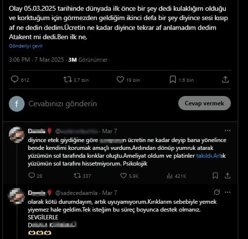 Damla Korkmaz sosyal medya hesabından yaptığı paylaşımda, "Olay 5 Mart 2025 tarihinde sokakta yürürken ilk önce bir şey dedi. Kulaklığım olduğu ve korktuğum için görmezden geldim. İkinci defa bir şey dediğinde sesi kısıp pardon ne dedin dedim. ’Ücretin ne kadar’ dediğinde tekrar pardon anlamadım dedim. ’Burası Atakent mi?’ dedi. Ben ilk söylediğinde ne dediğimde ’etek giydiğine göre ücretin ne kadar deyip’ bana yönelince ben de kendimi korumak amaçlı vurdum. Ardından dönüp yumruk atarak yüzümün sol tarafında kırıklar oluştu. Ameliyat oldum ve platinler takıldı. Artık yüzümün sol tarafını hissetmiyorum. Psikolojik olarak kötü durumdayım, artık uyuyamıyorum. Kırıklarım sebebiyle yemek yiyemez hale geldim. Tek isteğim bu süreç boyunca destek olmanız" açıklamasında bulundu. Kasten yaralamadan tutuklandı