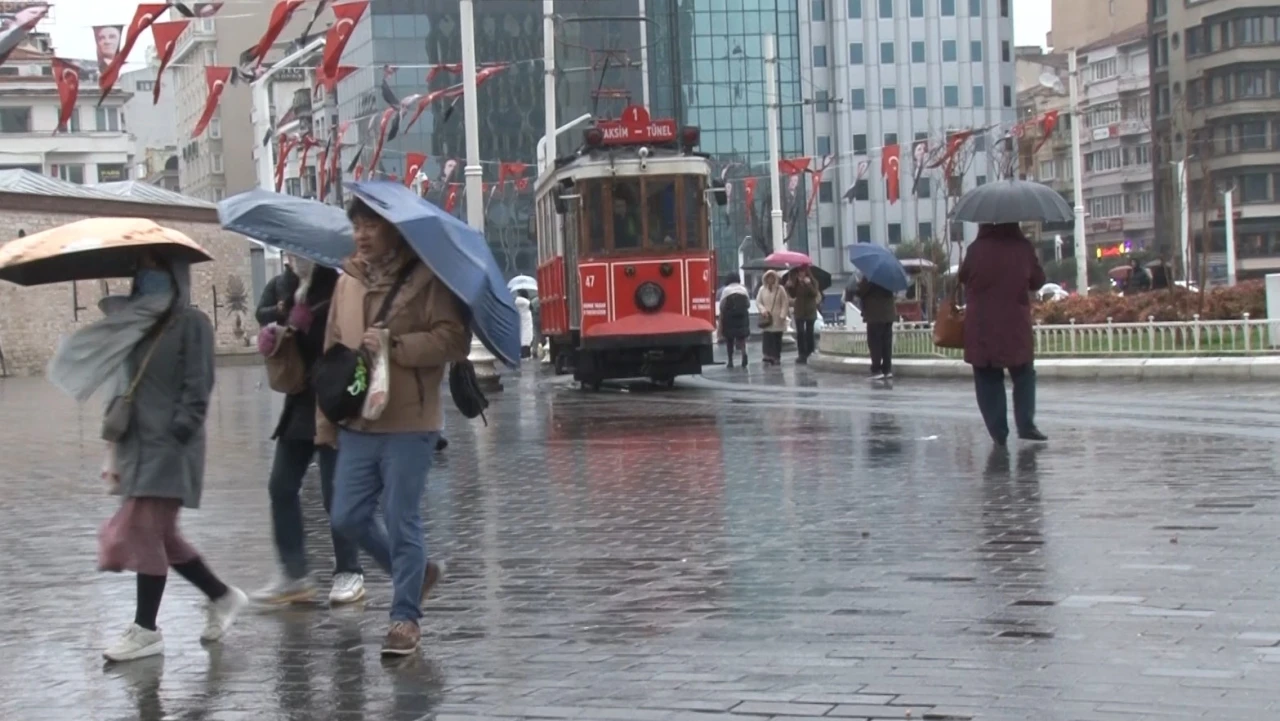 Meteoroloji Genel Müdürlüğü’nün yapmış olduğu uyarıların ardından İstanbul’da sabah saatlerinde başlayan yağmur ve soğuk hava etkisini sürdürüyor. Taksim Meydanı’nda da yağış aralıklarla etkili olurken, yağmura hazırlıksız yakalanan vatandaşlar zor anlar yaşadı. Şemsiyesi olmayanların otobüs duraklarında bekledikleri, bazı turist ve vatandaşların ise şemsiyeleriyle ilerledikleri görüldü.